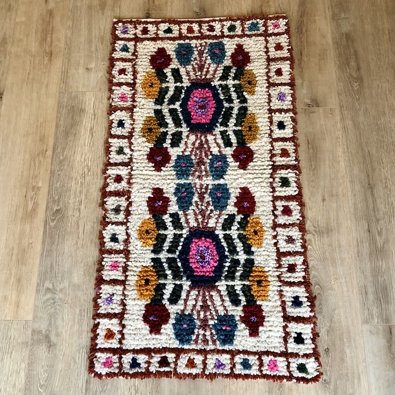 Tapis pure laine, entièrement fabriqué à la main par une famille d'artisans partenaire.
